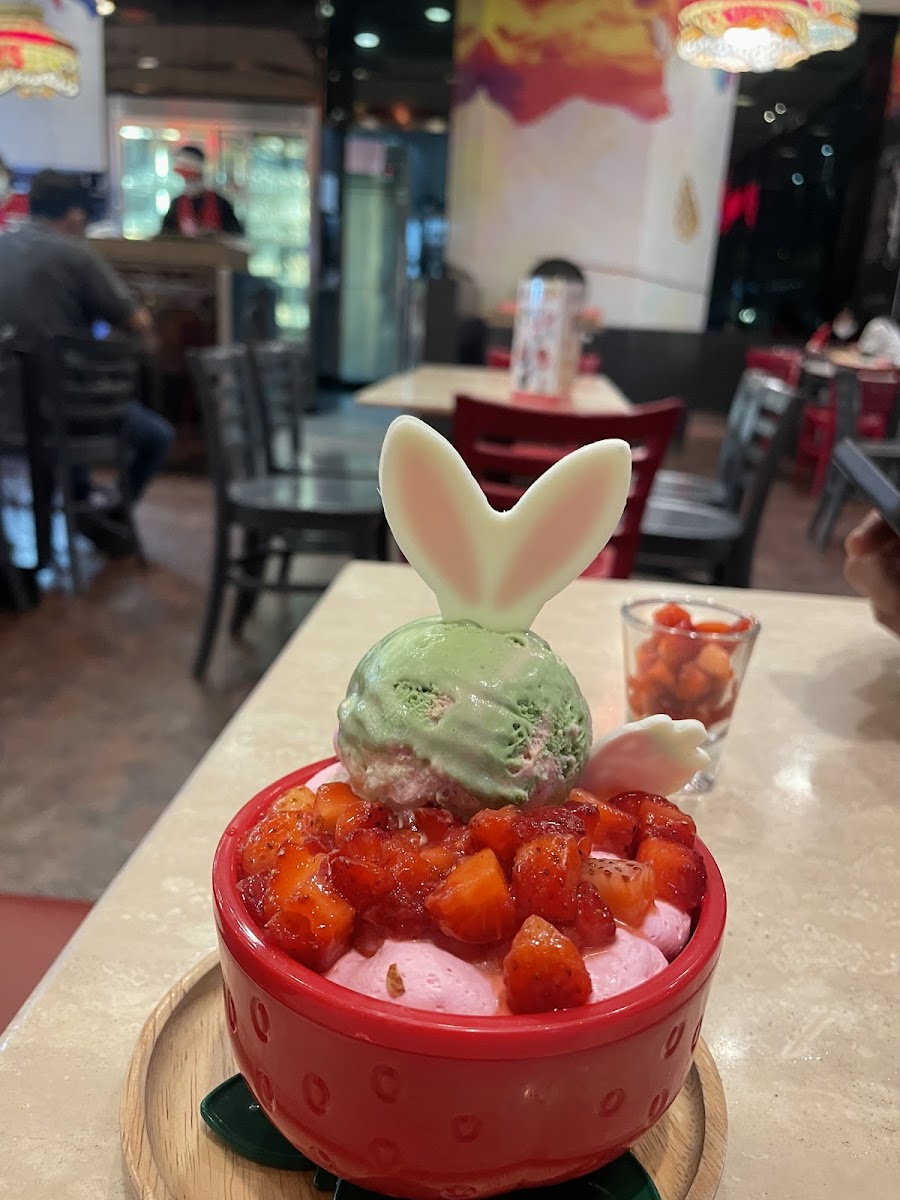 Upon entering, you'll find a spacious seating arrangement that caters to various preferences, whether you choose the air-conditioned indoor area or the pleasant outdoor space. The location is conveniently situated near the entrance of a shopping mall, adjacent to KFC, making it an easily accessible treat during your shopping adventures.